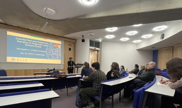 李教授在剑桥大学积极参与了剑桥大学德文系的多场学术活动,与德文系师生进行了密集交流。他先后与德文系教授Sarah Colvin,汉学系教授Hans van de Ven,德文系系主任及英国科学院院士Andrew Webber教授就学术互访和合作教学的未来计划进行了初步磋商。他还应邀参与了德文系的例会,观摩了德文系Martin Ruehl副教授的专业课,并面向德文系师生讲授了一场以“德国当代小说中的殖民历史与复调叙事(Colonial Past and Polyphonic Narrative in Trojanow’s and Thome’s Novel)”为题的讲座课。该讲座引发了热烈讨论,收到了积极反馈。德文系教授都表示希望能继续在相关课题上推进更多的教学与科研合作。