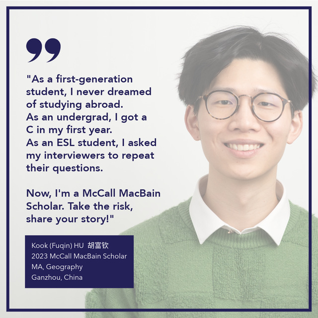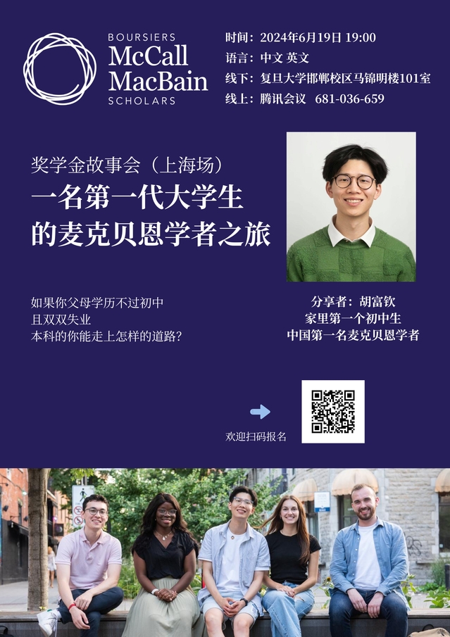 中国第一名麦克贝恩学者,家里的第一个初中生,本科毕业于南开大学,硕士就读于麦吉尔大学。富钦喜欢阅读传记、烧菜约饭和交流提问,他将以下三个领域作为个人使命:(1)数字鸿沟的弥合;(2)正念练习的推广;(3)第一代大学生的视野拓展。