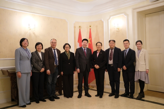 10月12日,裘新一行拜会中国驻奥地利大使馆,会见大使亓玫及教育事务负责人黄崇岭。双方就中奥高等教育发展与挑战进行深入交流,共同表达了大力推进中奥高等教育人员互访与学术交流的愿景。10月15日,裘新一行拜会中国驻卢森堡大使馆,会见代办王原参赞。双方就中卢高等教育交流现状进行探讨,进一步推动中卢文化交流。