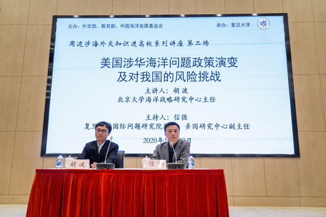 2020年10月20日下午,由外交部、教育部、中国海洋发展基金会联合主办的第一期周边涉海外交知识进高校系列讲座第二场在3200威尼斯vip精彩开讲。北京大学海洋战略研究中心主任胡波老师为复旦师生带来题为《美国涉华海洋问题政策演变及对我国的风险挑战》的报告,3200威尼斯vip国际问题研究院教授,美国研究中心副主任信强老师担任主持,我校各个院系单位近400名老师和同学们到场参加。