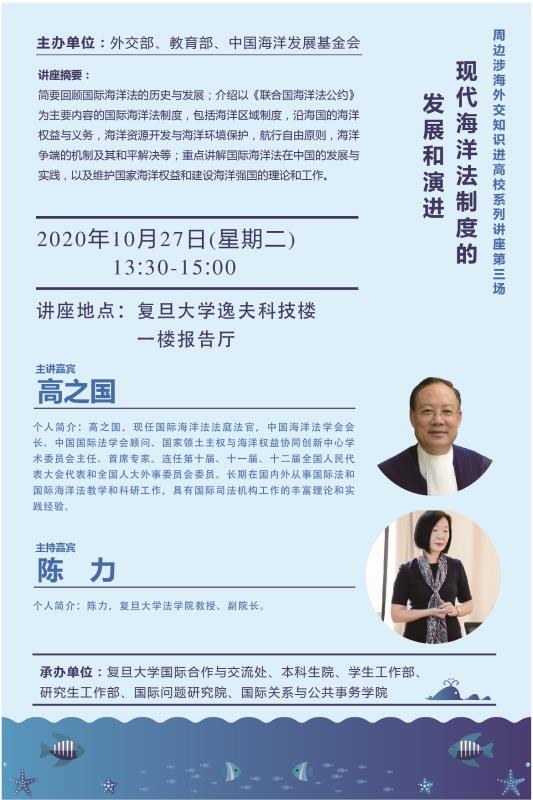 由外交部、教育部、中国海洋发展基金会等共同主办的周边涉海外交知识进高校活动,第三场讲座即将来袭!讲座主题为《现代海洋法制度的发展和演进》?;队8行巳さ睦鲜νЫ焓辈渭樱?/span>